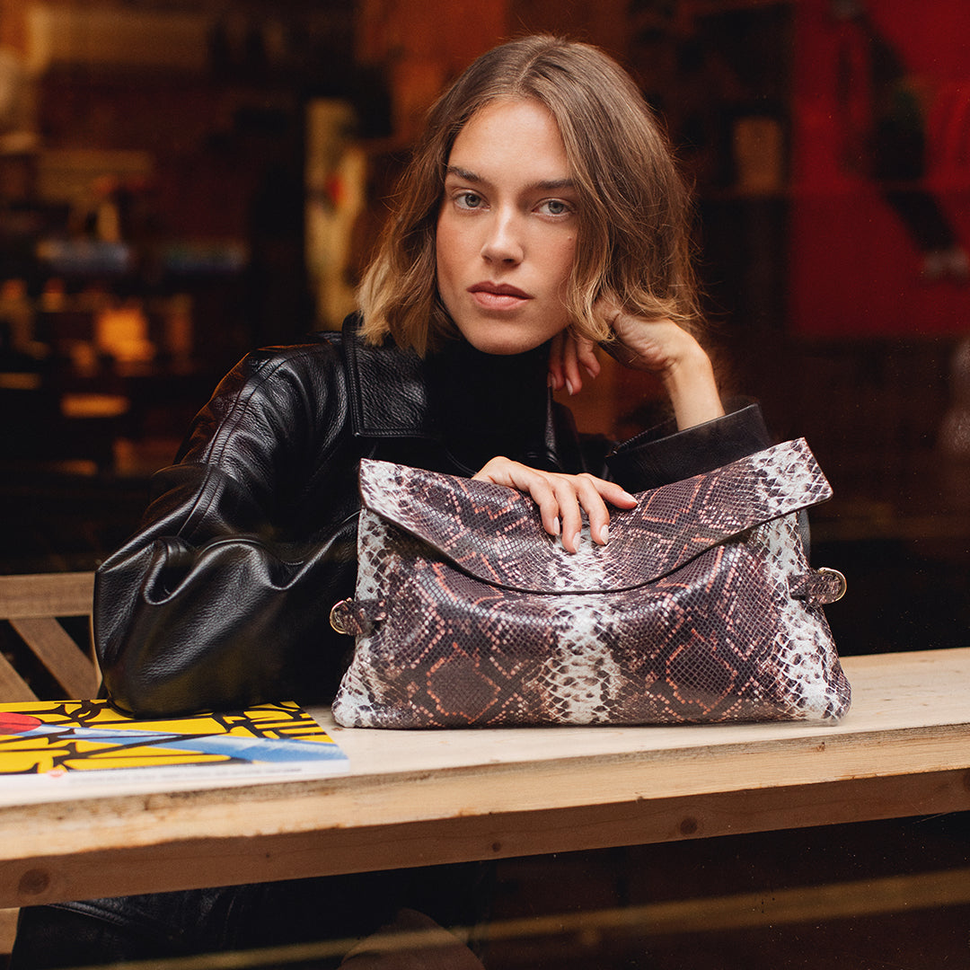 Inspired by paper shopping bags, but crafted from fine leathers. This classic rectangle silhouette is sleek and refined, with the crossover tab detail adding a subtle signature to the family.